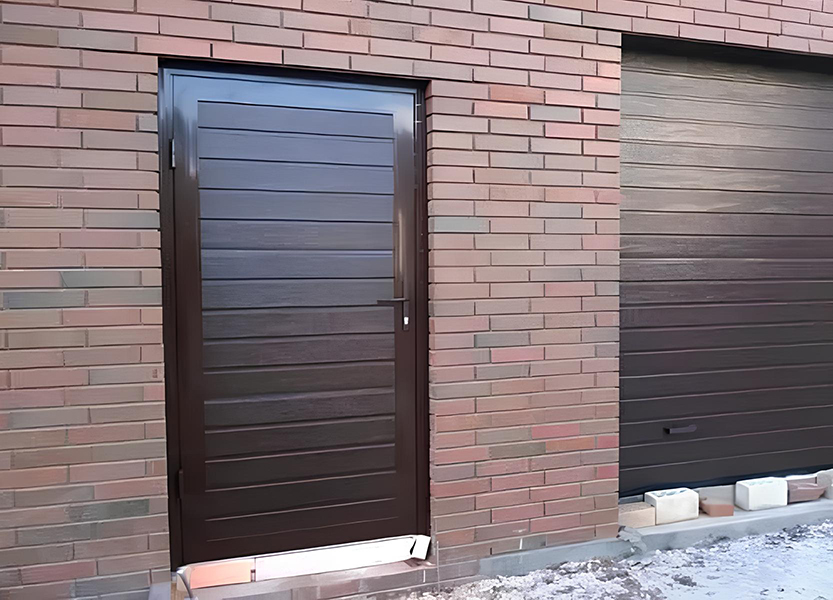 Дверь изготавливается из тех же панелей, что и ворота. Благодаря этому обеспечивается их гармоничное сочетание, а фасад здания приобретает завершенный вид.