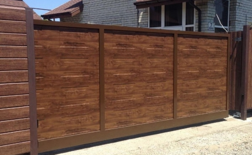 Ворота из сэндвич-панелей, имитирующих текстуру древесины (золотой дуб, темный дуб, вишня), обладают всеми преимуществами стальных ворот и придают коттеджу элементы престижа и индивидуальности.