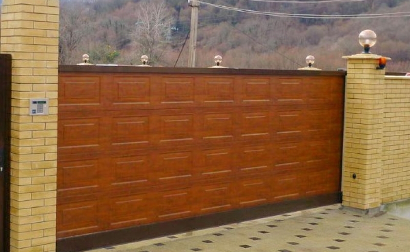 Ворота из сэндвич-панелей, имитирующих текстуру древесины (золотой дуб, темный дуб, вишня), обладают всеми преимуществами стальных ворот и придают коттеджу элементы престижа и индивидуальности.