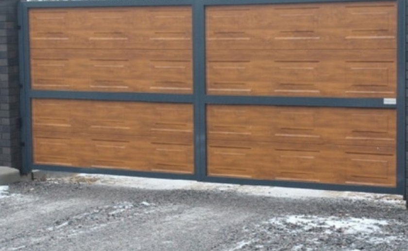 Ворота из сэндвич-панелей, имитирующих текстуру древесины (золотой дуб, темный дуб,  вишня), обладают всеми преимуществами стальных ворот и придают коттеджу  элементы престижа и индивидуальности.